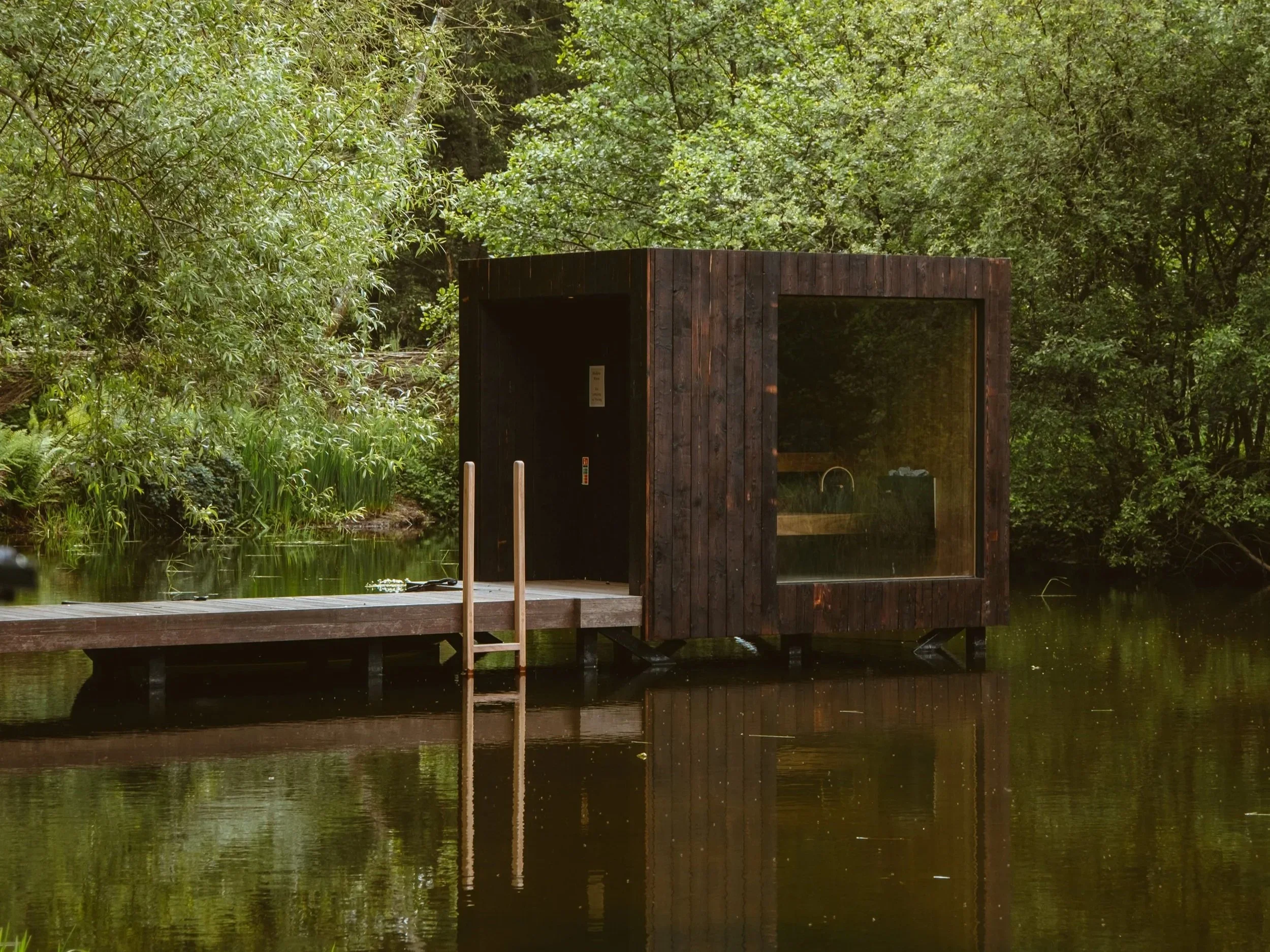 The sauna suited the lake better. It became a destination in its own right — a floating box suspended quietly at the centre, proportioned so that water surrounded it on all sides.