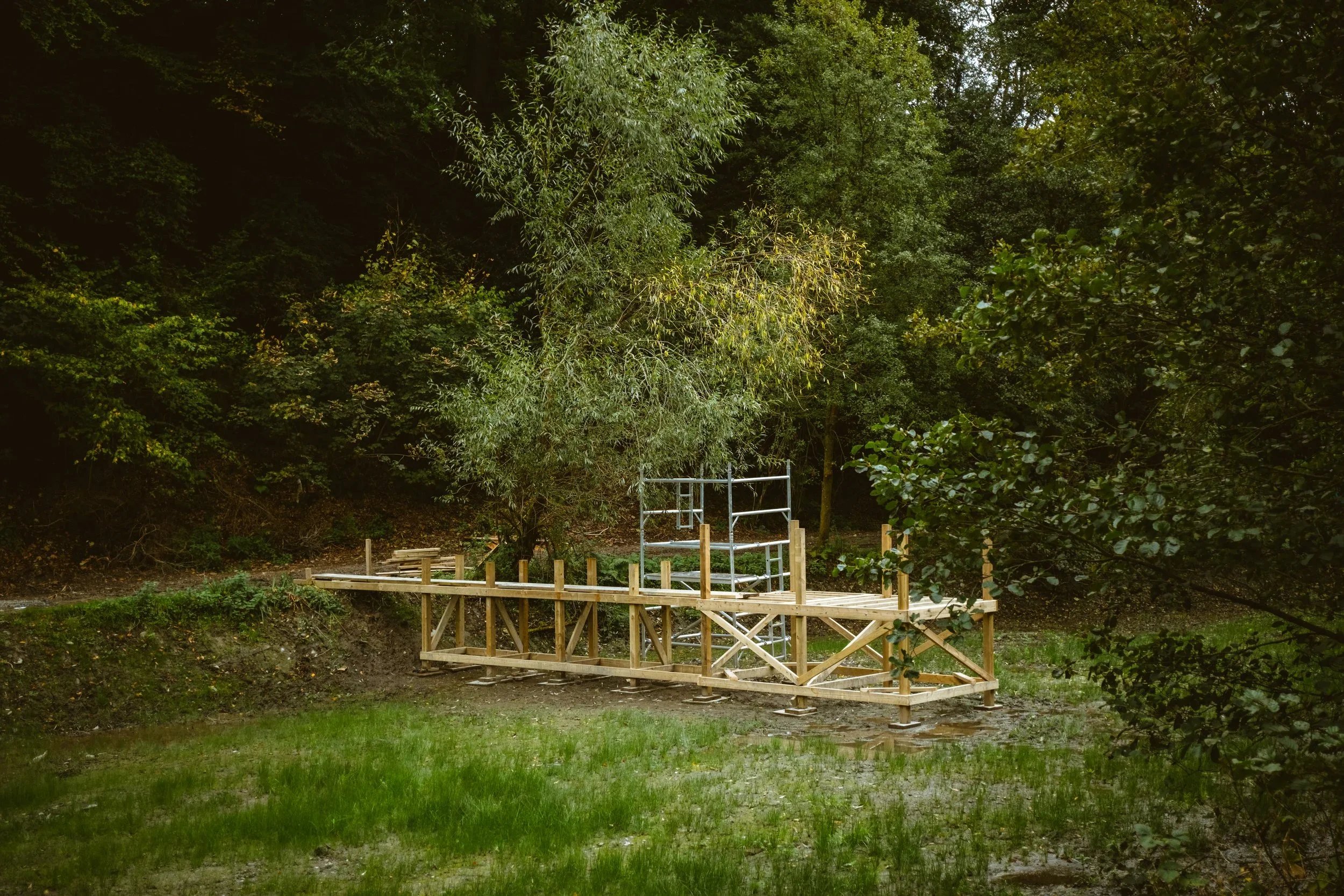 Fitting that pane of glass was a moment. Four of us carried it gingerly down the jetty and eased it into place from the inside — one of the last jobs before filling the lake.