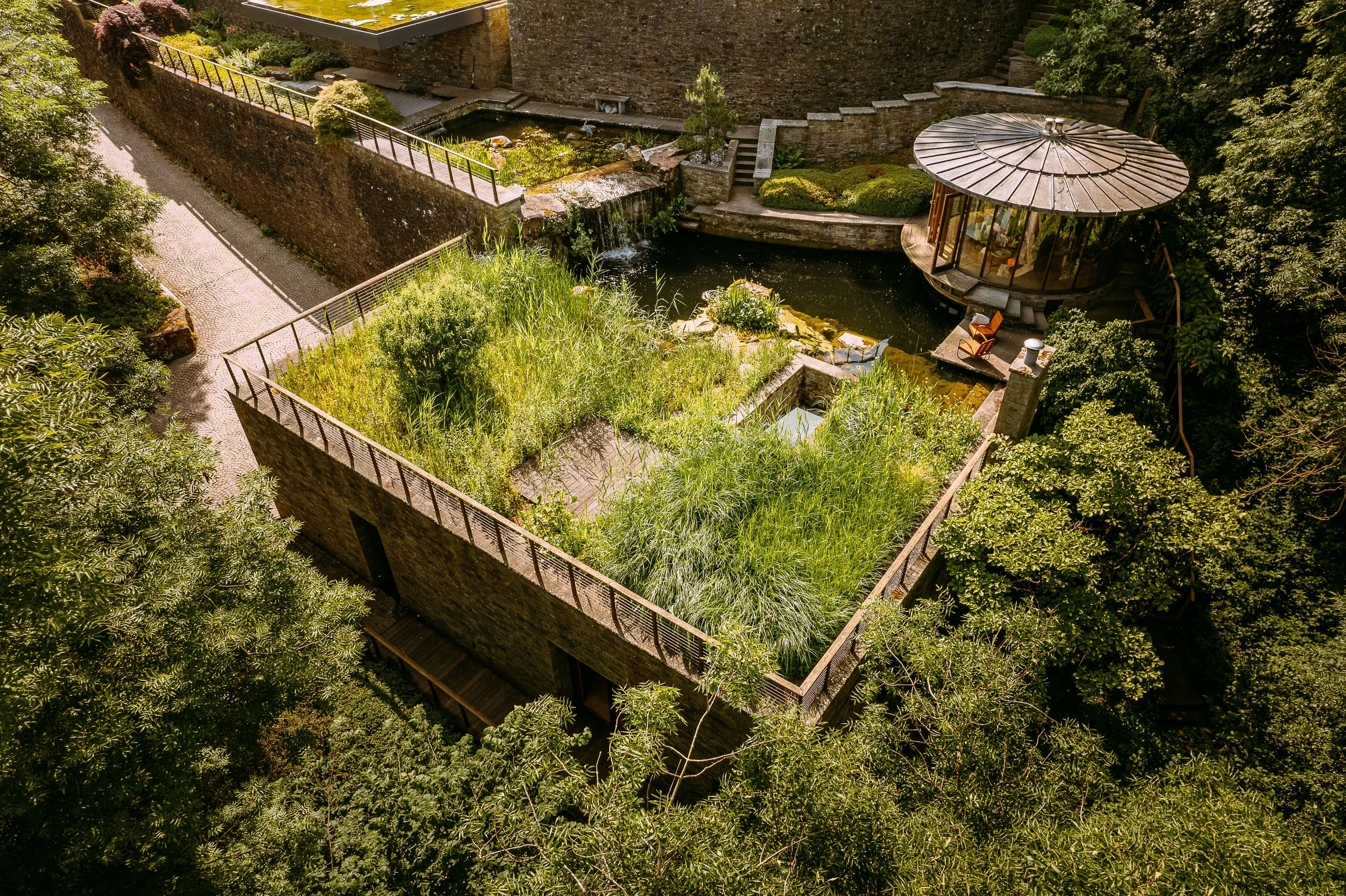 Features: Wood-fired sauna, swimming pond, outdoor bath, waterfall